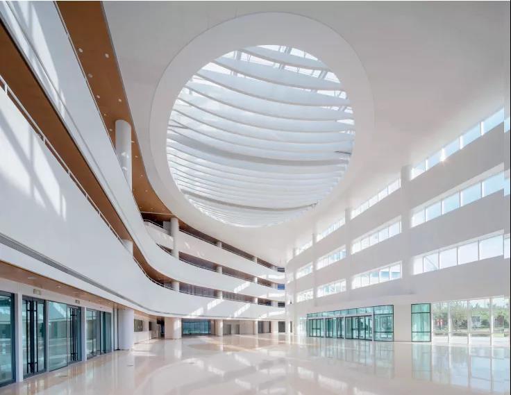 由于院區(qū)用地呈不規(guī)則的梭形,且用地處于西側(cè)城市主要交通與東側(cè)居住區(qū)的過渡區(qū)域,方案創(chuàng)新性地引入“城市客廳”的設(shè)計(jì)理念,用地中心位置的開敞共享公共大廳不僅作為與城市、居住區(qū)進(jìn)行空間對(duì)話的形象節(jié)點(diǎn),而且將整個(gè)院區(qū)各功能自然地整合在一起。
