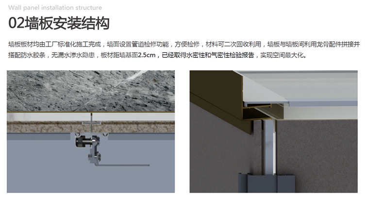 是通過(guò)對(duì)鋼板表面進(jìn)行處理后,按現(xiàn)場(chǎng)尺寸定制折彎加工的墻板標(biāo)準(zhǔn)化產(chǎn)品;并采用獨(dú)特的飾面扣裝連接方式,安裝簡(jiǎn)易便利,不打釘,不打膠,連接穩(wěn)定牢靠,可拆卸回收。飾面材質(zhì)和式樣有豐富的選擇和搭配,石紋、木紋、壁紙、壁布、涂裝板,滿足各種類型的裝修風(fēng)格和設(shè)計(jì)需求。
