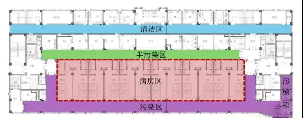 醫(yī)院四周為傳染病隔離區(qū),有30米-50米,集中于傳染病病人隔離區(qū)。為了降低感染風(fēng)險(xiǎn),住院樓醫(yī)院建筑平面被迫分為潔凈區(qū)、半污染區(qū)和污染區(qū)三個(gè)區(qū)域,每個(gè)區(qū)域都獨(dú)立分隔。采取不同的隔離措施和不同的布局為不同的功能室和不同的感染源。