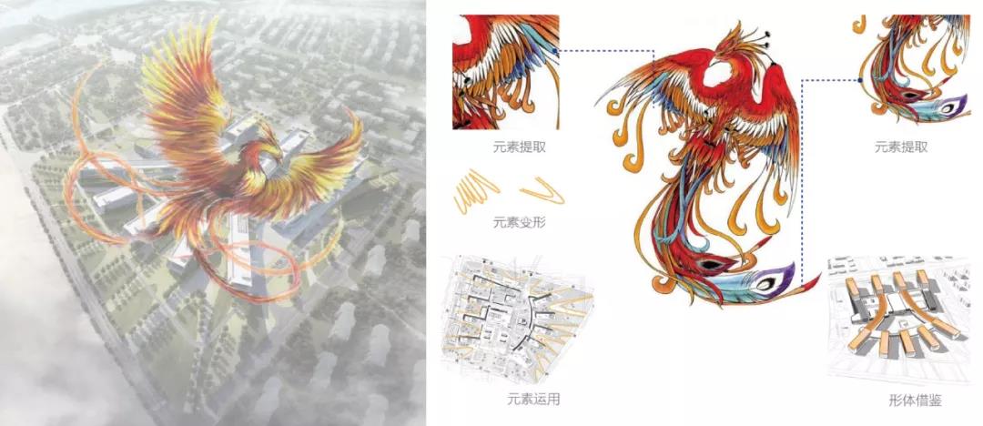 日出東方、火鳳騰飛——方案延續(xù)當(dāng)?shù)貙?duì)太陽(yáng)的崇拜及鳳凰城遺址的歷史文化積淀,取意象征太陽(yáng)的神鳥(niǎo)鳳凰,將鳳凰羽翼和尾翼的線條進(jìn)行提煉演變,形成建筑和景觀的構(gòu)成元素,表達(dá)了對(duì)歷史和文化的呼應(yīng)。