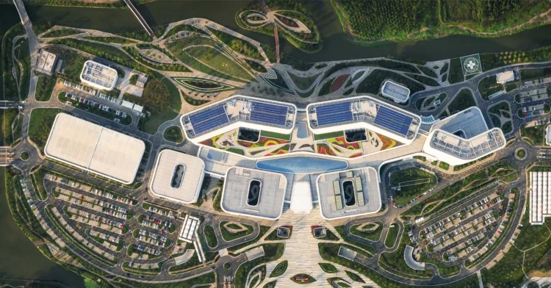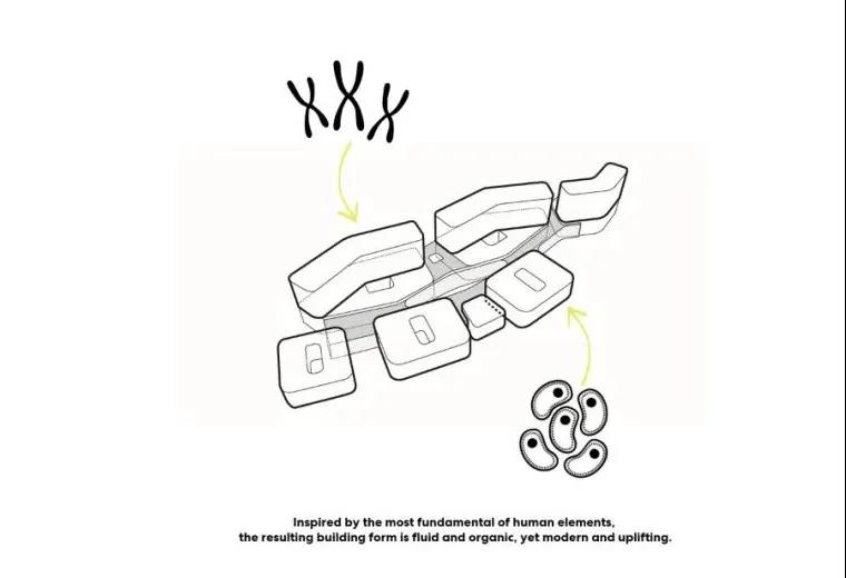 建筑的設(shè)計(jì)理念源自大自然最基本的生命元素——細(xì)胞。南側(cè)門(mén)診樓和行政樓被賦予細(xì)胞狀的外觀;北側(cè)建筑體塊的排布則模擬了細(xì)胞內(nèi)染色體的形態(tài)。建筑的朝向和角度與河道景觀交相呼應(yīng),呈現(xiàn)出律動(dòng)的美感。