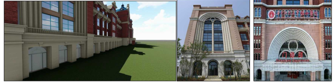 外立面采用正統(tǒng)的英式古典復興風格,造型復雜,由石材、軟瓷、仿石鋁板、 GRC構件、西式陶瓦等多種材料拼接和結合,多種材料交替使用,界面清晰,線條順直, 曲線圓滑;西式陶瓦、坡屋面、幕墻等建筑手法的巧妙運用,賦予建筑獨特的韻律和美感。