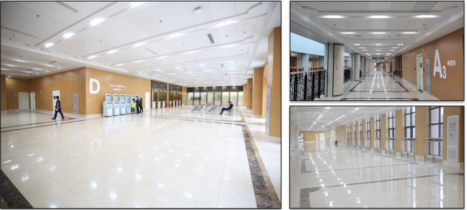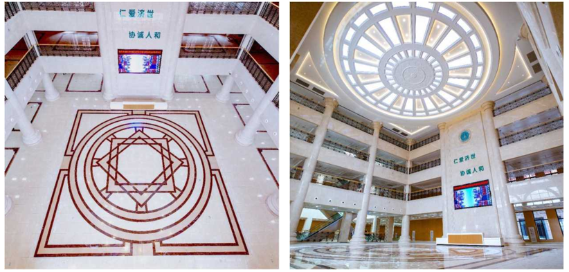 門診大廳采用多層圓形GRG吊頂,質量輕、不變形、安全性好、防潮、防火、阻燃性能好,屬綠色環(huán)保材料類,造型豐富,聲學效果好,加工周期短,施工便捷、品質穩(wěn)定,裝飾效 果凸顯大氣,整體風格協(xié)調,與地面拼花上下對中,天地相應。